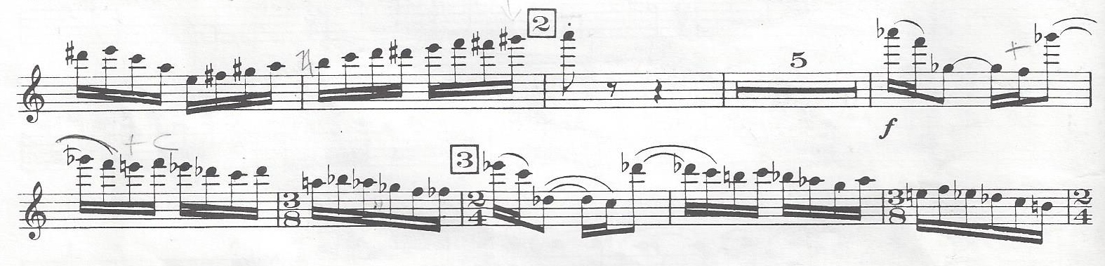 Another great way to use egg shakers is in connection to pieces written in complicated meters where the tendency to rush notes as the meter changes is extremely tempting. The following excerpt, taken from the 1st movement of Ibert’s Sonata for Flute and Orchestra, illustrates such a passage. As the meter changes in the measure before rehearsal number 3, it is quite easy to slightly rush the 16th note passage in the 3/8 meter, however the duration of the 16th notes must correspond to the tempo established in the previous 2/4 measures. As we did in the above example, practice this passage away from the flute using egg shakers (ideally with a recording as the big beat changes here and a metronome fails to recognize this change). What do you notice? Where are you falling behind the tempo? Practice this exercise until the rhythm in the egg shakers is consistent then return to the flute and play the piece as written. Notice a difference? At this point your rhythm will be even throughout the meter changes.