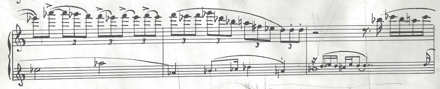Finally, egg shakers make it possible to practice note groupings away from the instrument. By placing a small accent at the beginning of each note grouping, one can develop a chunking plan first on the shakers before implementing into the music itself. An example of this type of note grouping can be found in the 3rd movement of the Vine Sonata for Flute and Piano. As you can see in this example, grouping the complicated 16th note pattern in the following manner helps keep the music moving forward without becoming monopolized by the repetitive rhythm. Again, practice this first on the egg shakers with a steady slow beat by placing a slight accent on the first note of each grouping. When you reach performance tempo on the shakers, translate the groupings to the flute. At this point your 16th notes will be even and your groupings will be clear.