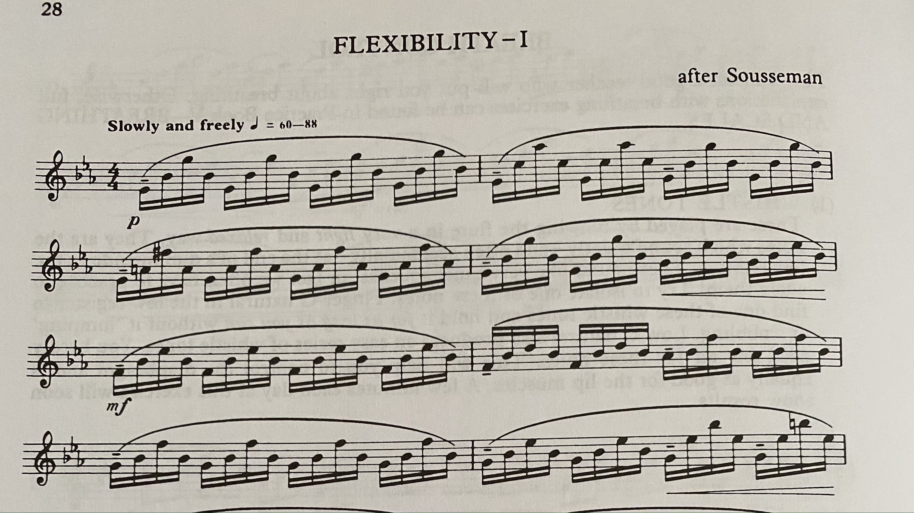 - There are a number of octave leaps in this excerpt. A good way to train your embrochure for these leaps is to add the Flexibility Exercise #1 from Trevor Wye’s Practice Book on Tone to your daily warm-up routine. Focus on keeping the tone stable while training your lips to gracefully move between each register. Another great warm up to help you work on flexibility is to add harmonic exercises to the mix. There is a wonderful harmonic exercise on Page 6 of Trevor Wye’s Tone book that is simple enough to practice daily. Give it try!