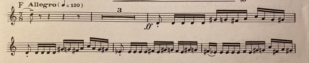 The work also features flutter tonguing, extreme dynamic changes, and irregular phrases.