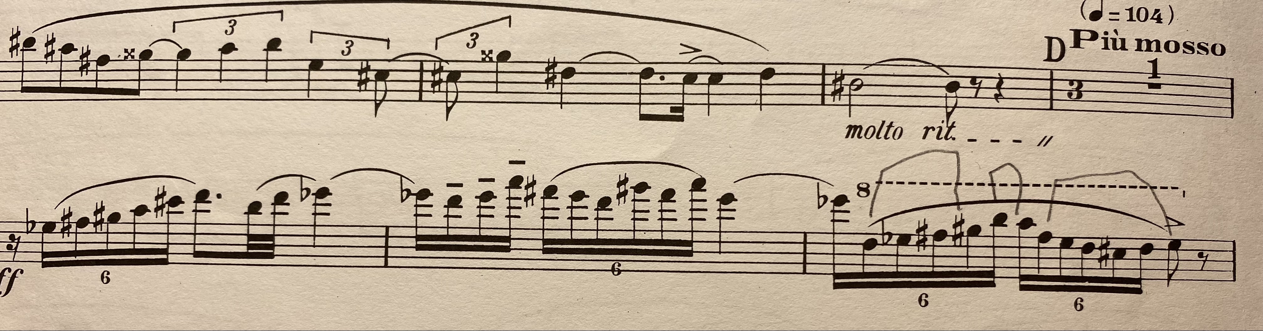 One instance where trick fingerings come in handy is in 3 measures after rehearsal letter D. Overblow a B, Ab, G, C#, and B on beat 2, while playing a regular high A on the last 16th note. The next measure contains another opportunity to use harmonic fingerings by overblowing a B to achieve the high F#s and overblowing a C# to achieve the high G#s.
