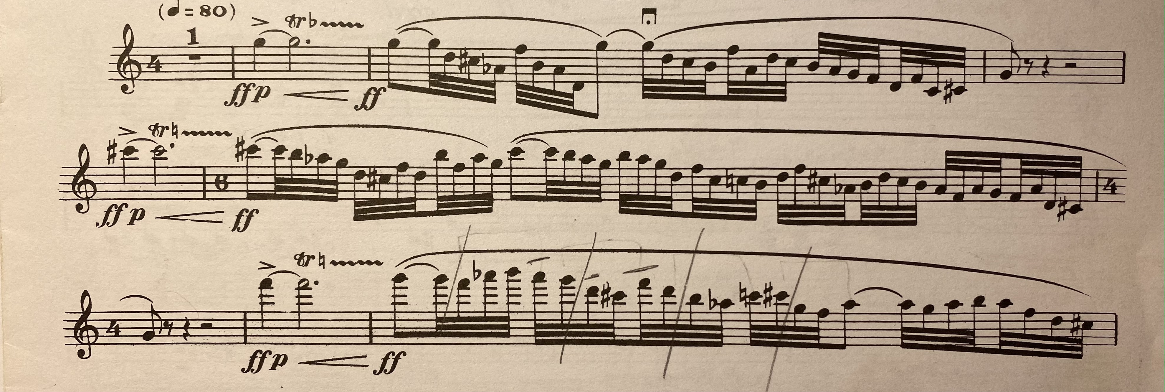 The work also features flutter tonguing, extreme dynamic changes, and irregular phrases.