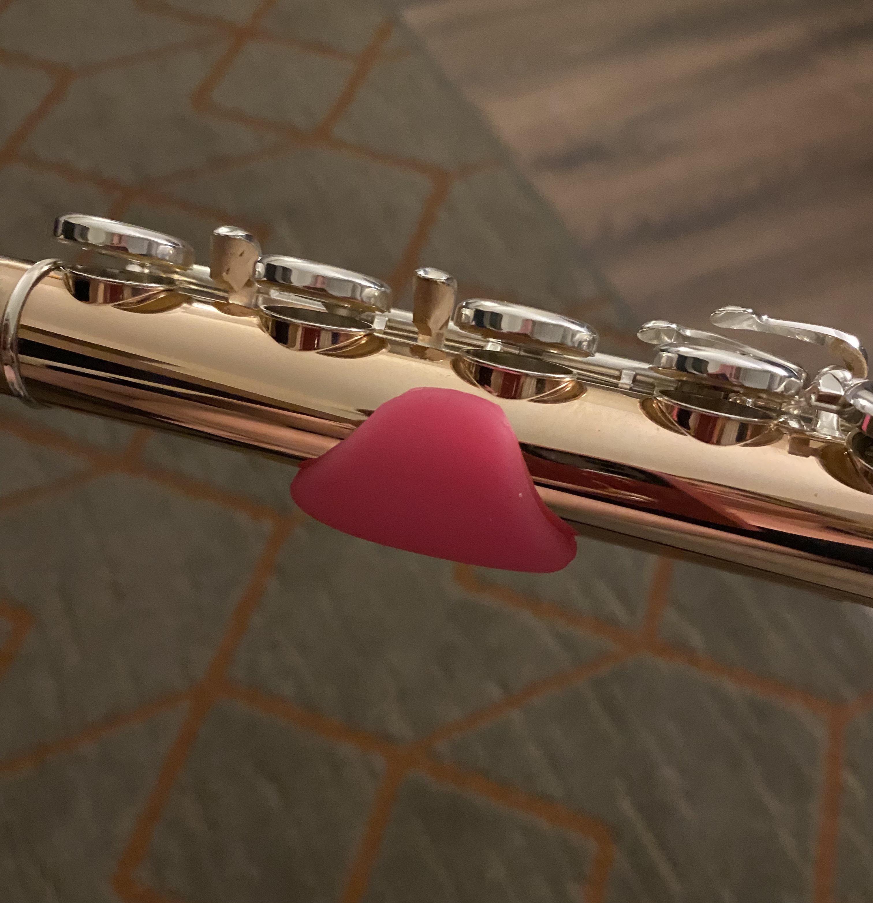 Silicone Flute Cushion by Caccini. I really like this one! I have struggled over the years to find a thumb port for my right hand that is reliable, yet flexible (in case I need to move it around to experiment with different hand positions), comfortable (aka not hard plastic), and also adorable/fashionable/a conversation starter. This thumb port option fits all of those bills! It is soft but not too cushy, providing more stability for your right hand than a Flute Gel (which I prefer for the left hand). These come in a variety of colors to fit your personal vibe. I chose pink because, well, I am a flute playing Barbie at heart. Perfect right hand guide for my thumb and personal brand!