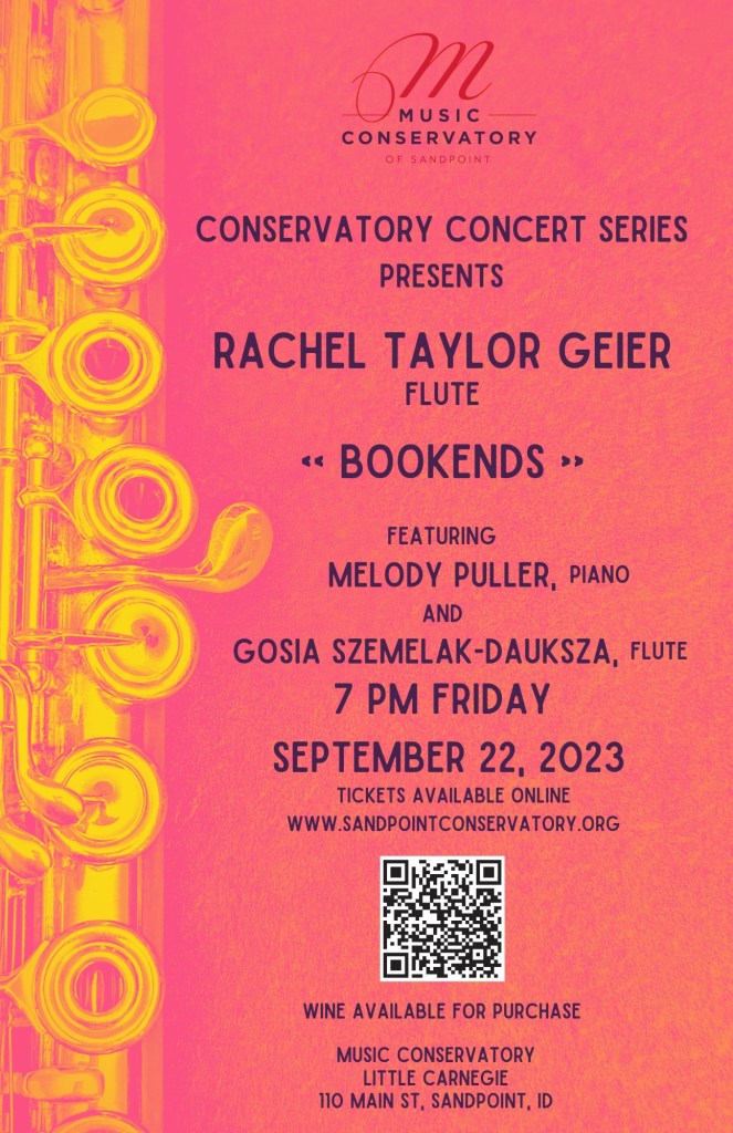 SEPTEMBER 22, 2023, 7:00 pm. Music Conservatory of Sandpoint Concert Series, Guest Artist Recital, “Bookends.” Featuring works by Debussy, Vivaldi, Altes, Stoner, Busser, Paganini, and Borne-Bizet.